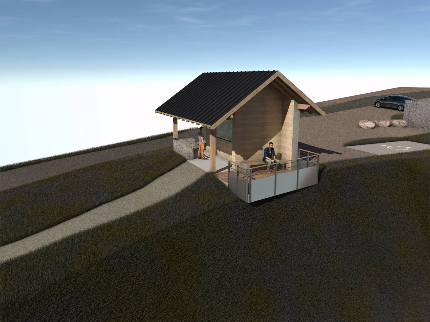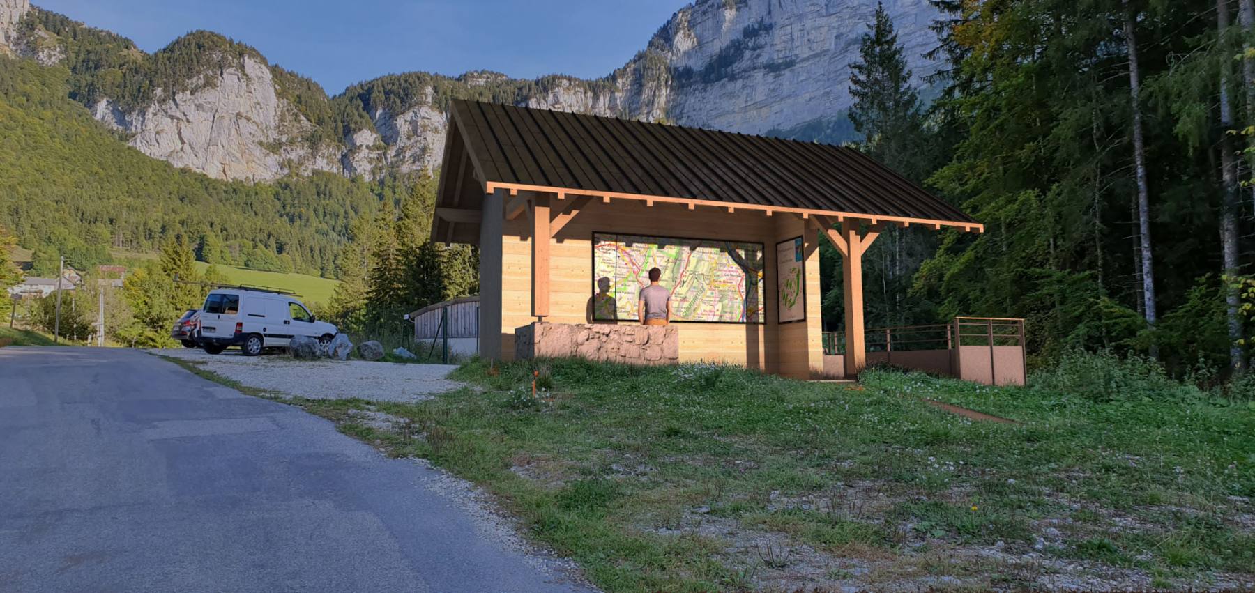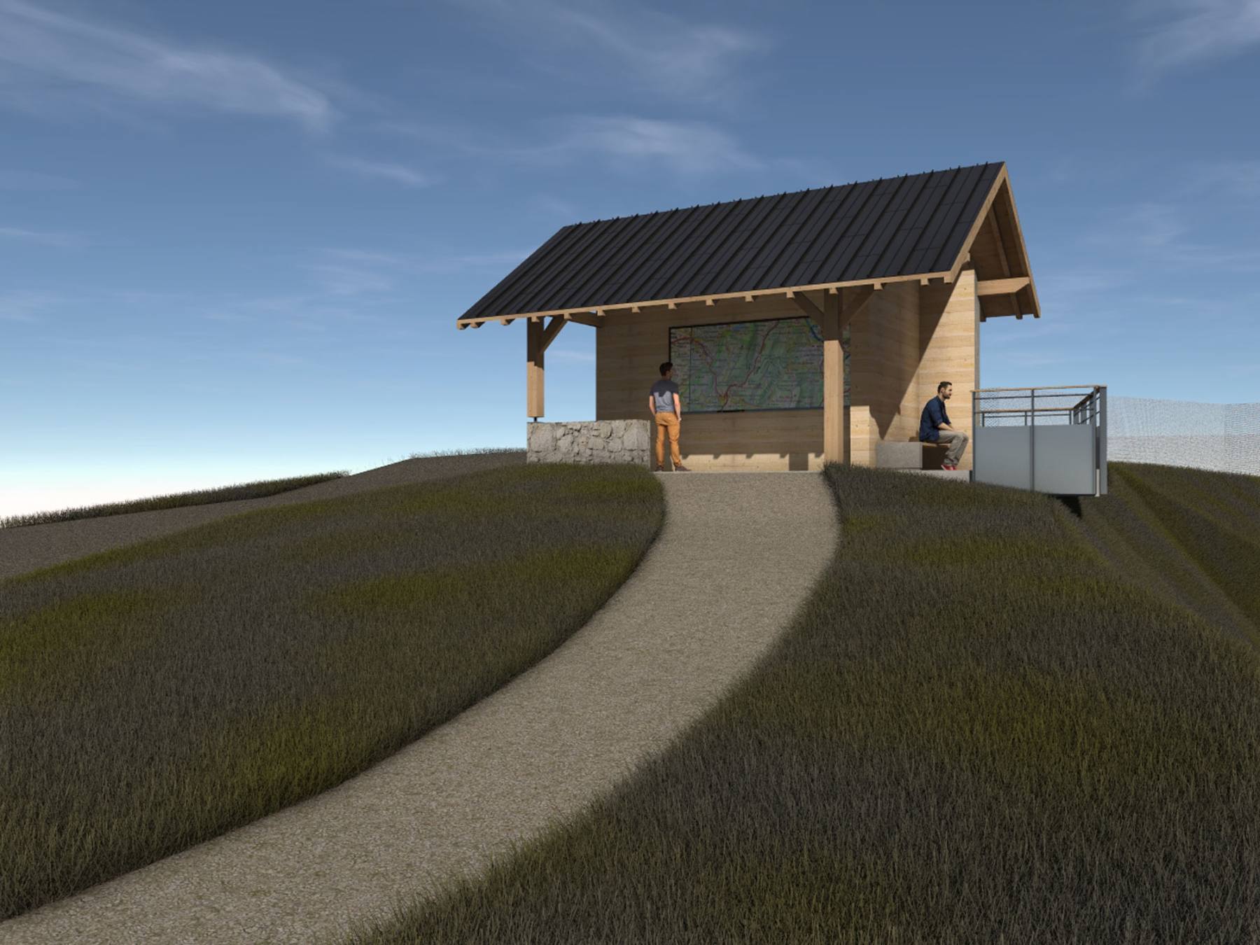 Le projet consiste en la construction d'un bâtiment public d'information, comprenant des sanitaires et un local à ordures. Il s'inscrit comme équipement d'intérêt collectif et public. Le volume « information » est ouvert, contrairement aux volumes sanitaires et ordures qui sont clos et couverts. Cet espace a été pensé pour accueillir le public lors de son arrivée sur ce site très touristique, le renseigner grâce aux différents panneaux et cartes, et l'abriter en cas d'intempéries. L'architecture du projet correspond aux codes de l'architecture locale avec un emploi de matériaux traditionnels qualitatifs.