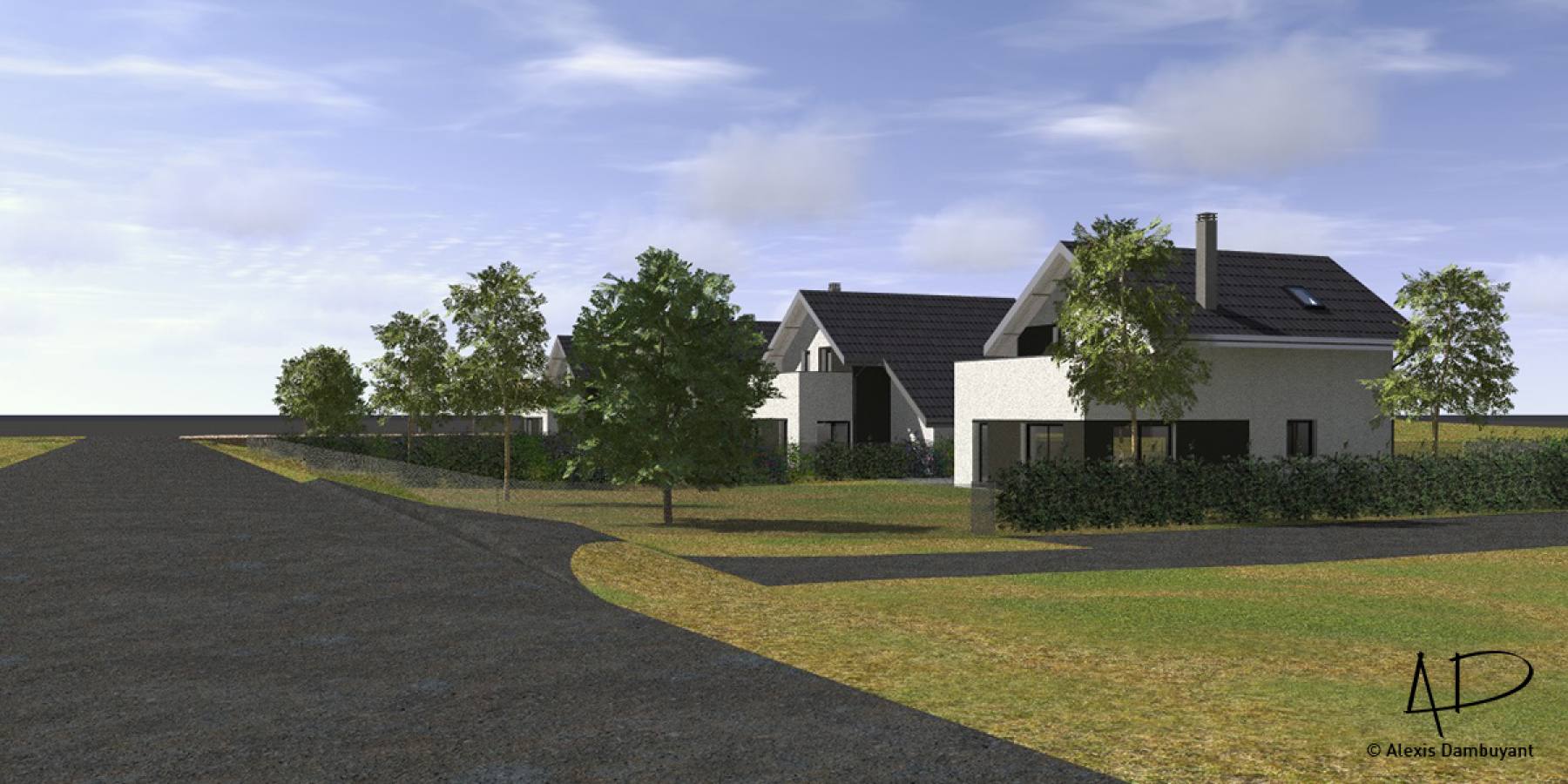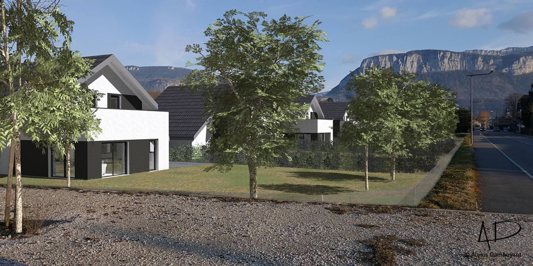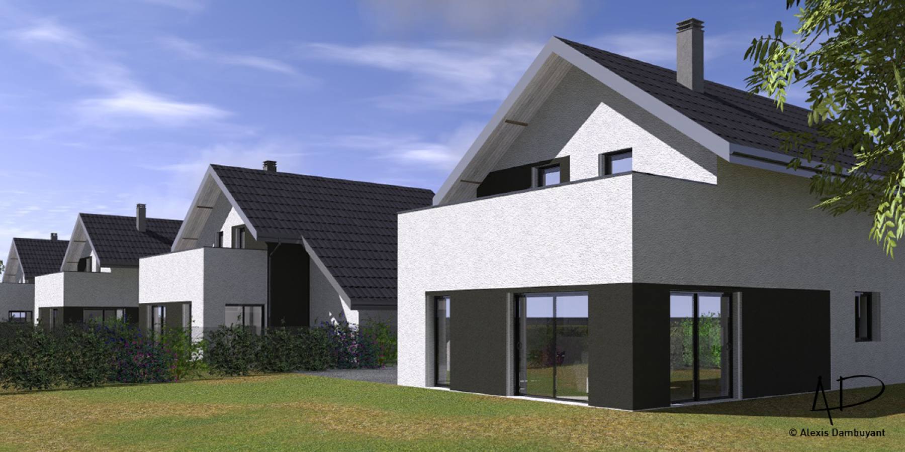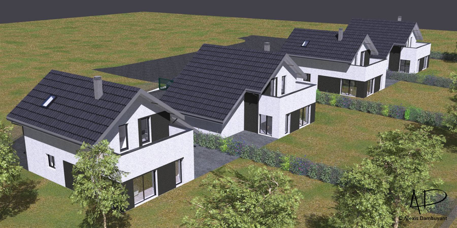 Le projet consiste en la création d'un ensemble de 4 maisons individuelles de deux étages (R+1). Chaque logement se compose d'un volume principal de 5 pièces et d'un stationnement clos et couvert attenant. Le projet est conçu avec une architecture simple, épurée et contemporaine tout en respectant son environnement immédiat. Situé dans un lotissement, l’ensemble des quatre maisons est conçu pour créer une entité cohérente, intégrée mais marquant l’entrée de ville. En effet, les constructions sont implantées en retrait de la limite Sud afin de permettre un aménagement engazonné et arboré. Ce retrait permet également un décalage maximum vis-à-vis de la RN 1006 pour limiter les vues dans les logements et augmenter le confort général intérieur. L’implantation est également faite de manière à créer une perspective marquée en entrée de ville par le dessin des arbres, des haies et des constructions.