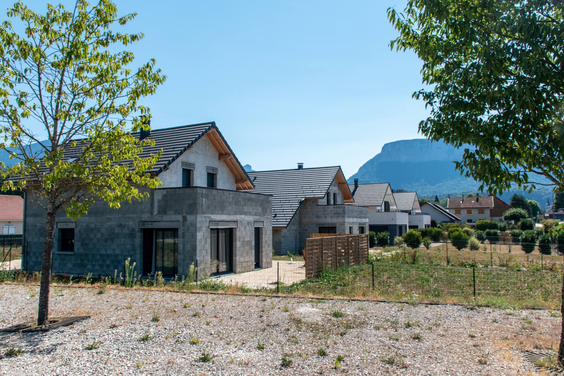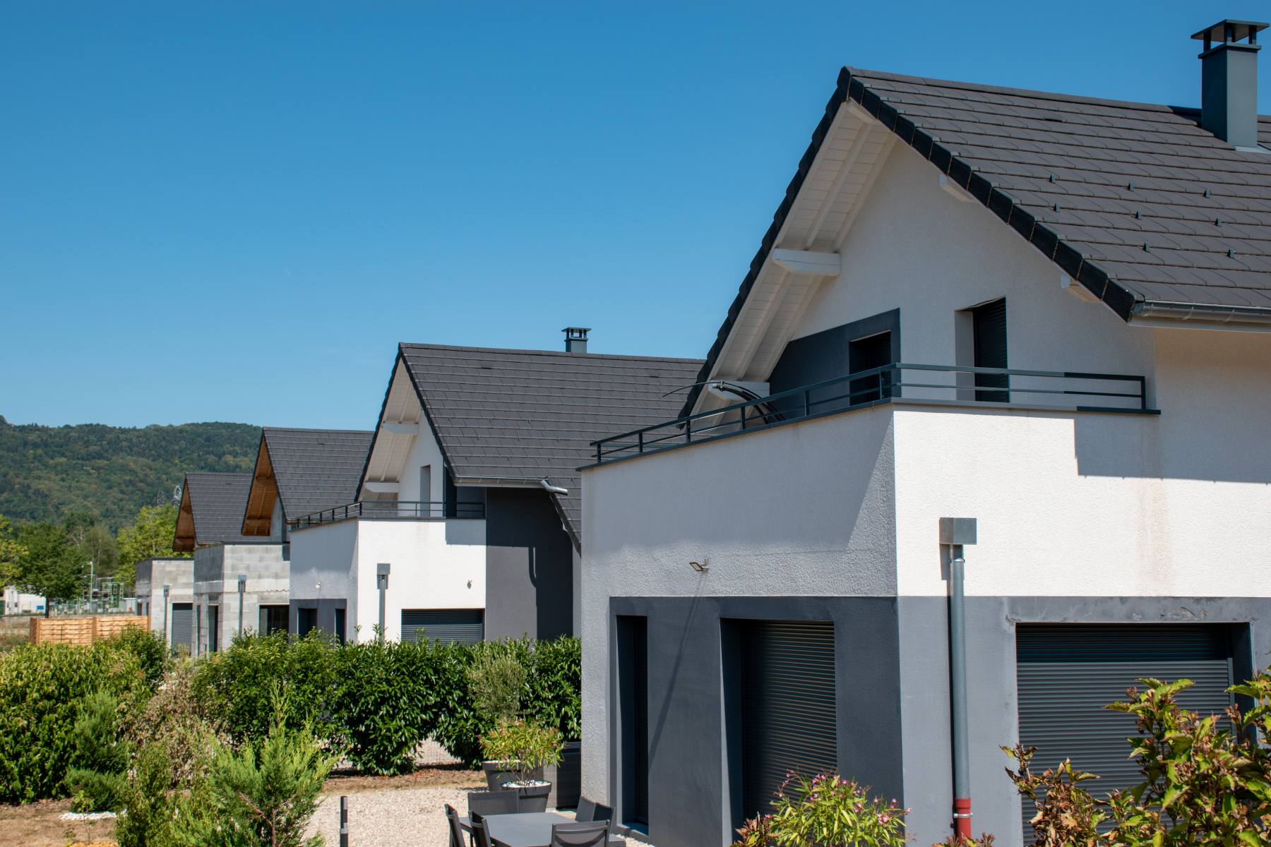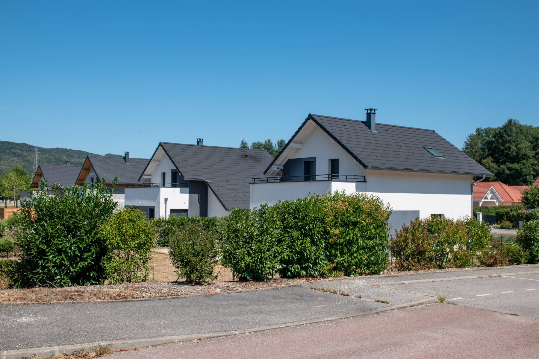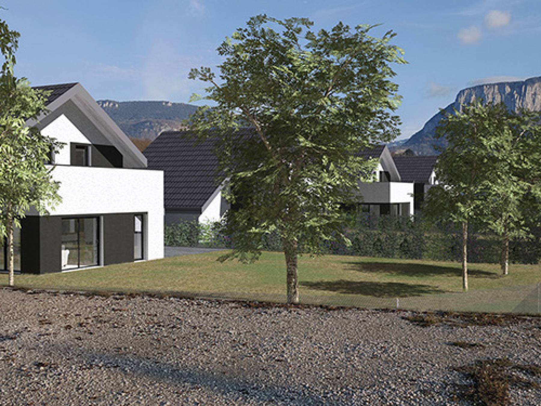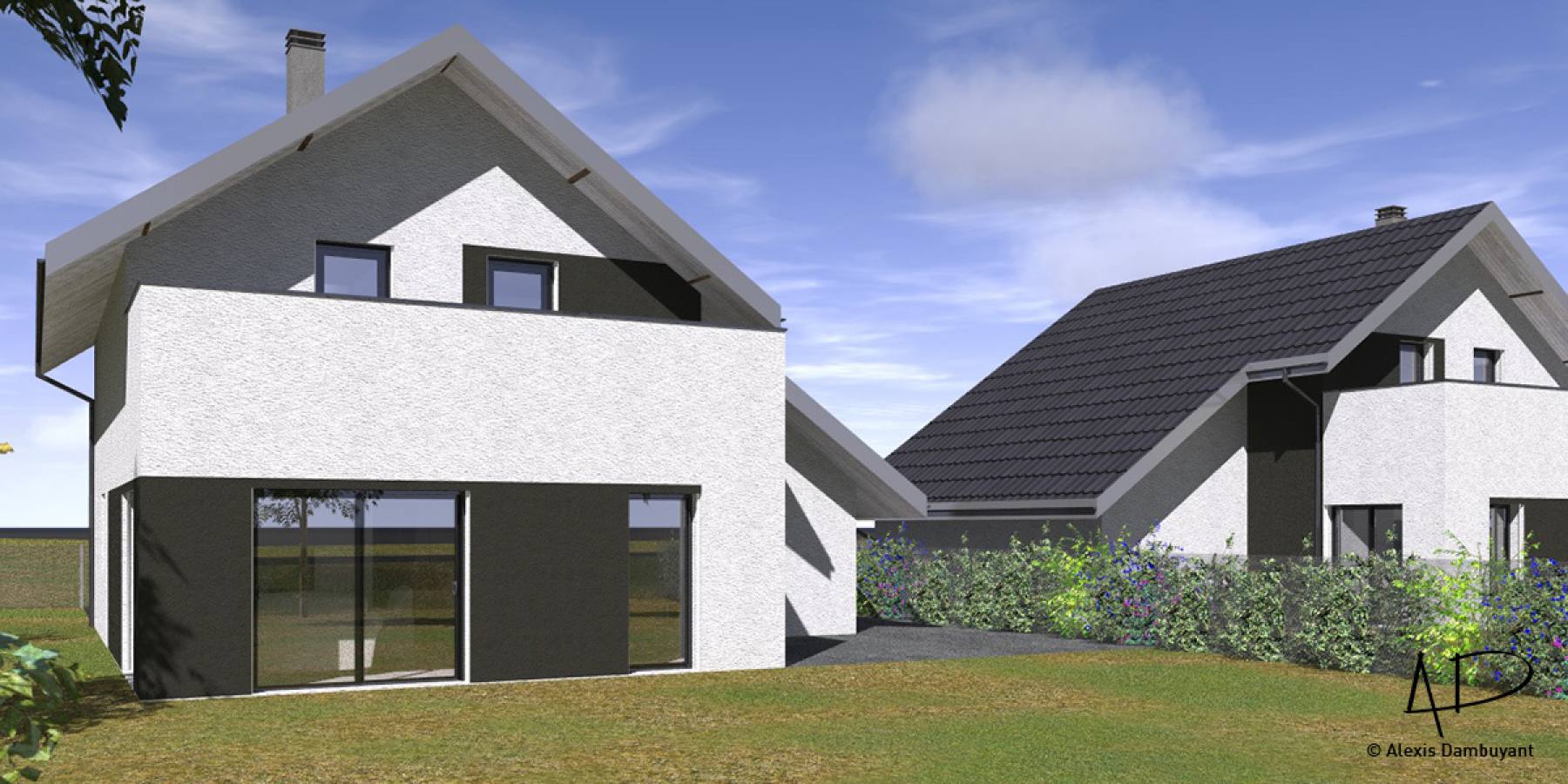 Le projet consiste en la création d'un ensemble de 4 maisons individuelles de deux étages (R+1). Chaque logement se compose d'un volume principal de 5 pièces et d'un stationnement clos et couvert attenant. Le projet est conçu avec une architecture simple, épurée et contemporaine tout en respectant son environnement immédiat. Situé dans un lotissement, l’ensemble des quatre maisons est conçu pour créer une entité cohérente, intégrée mais marquant l’entrée de ville. En effet, les constructions sont implantées en retrait de la limite Sud afin de permettre un aménagement engazonné et arboré. Ce retrait permet également un décalage maximum vis-à-vis de la RN 1006 pour limiter les vues dans les logements et augmenter le confort général intérieur. L’implantation est également faite de manière à créer une perspective marquée en entrée de ville par le dessin des arbres, des haies et des constructions.