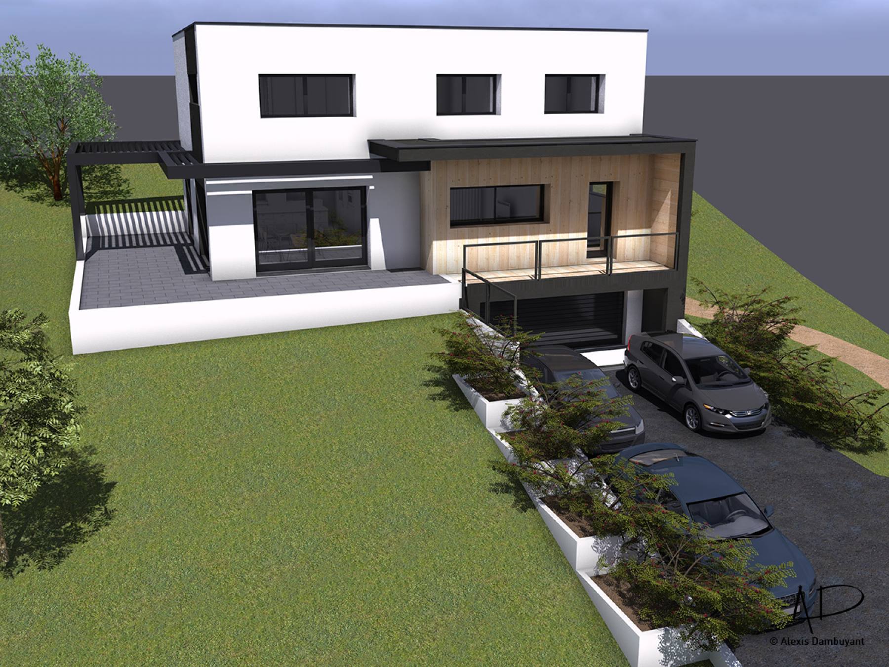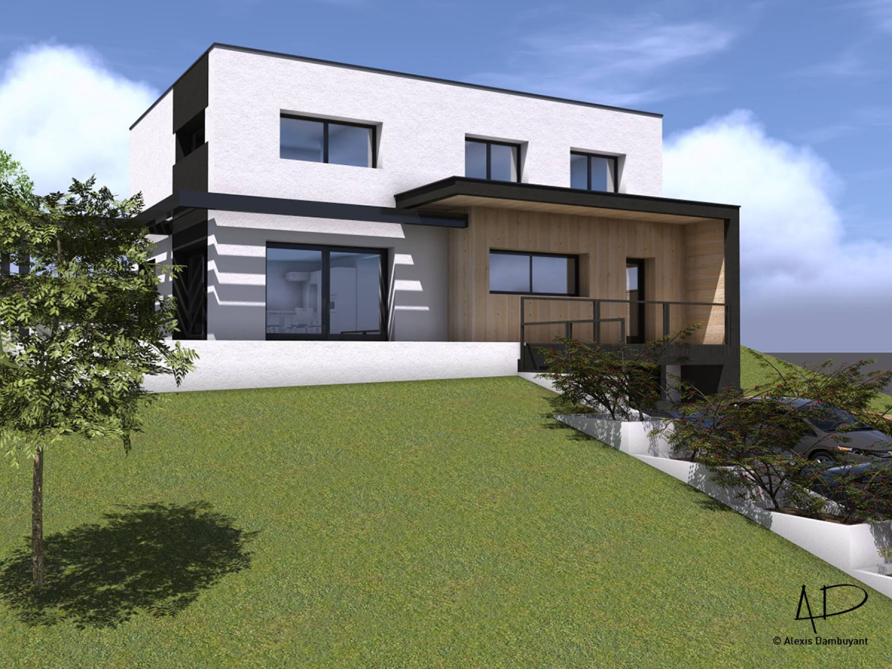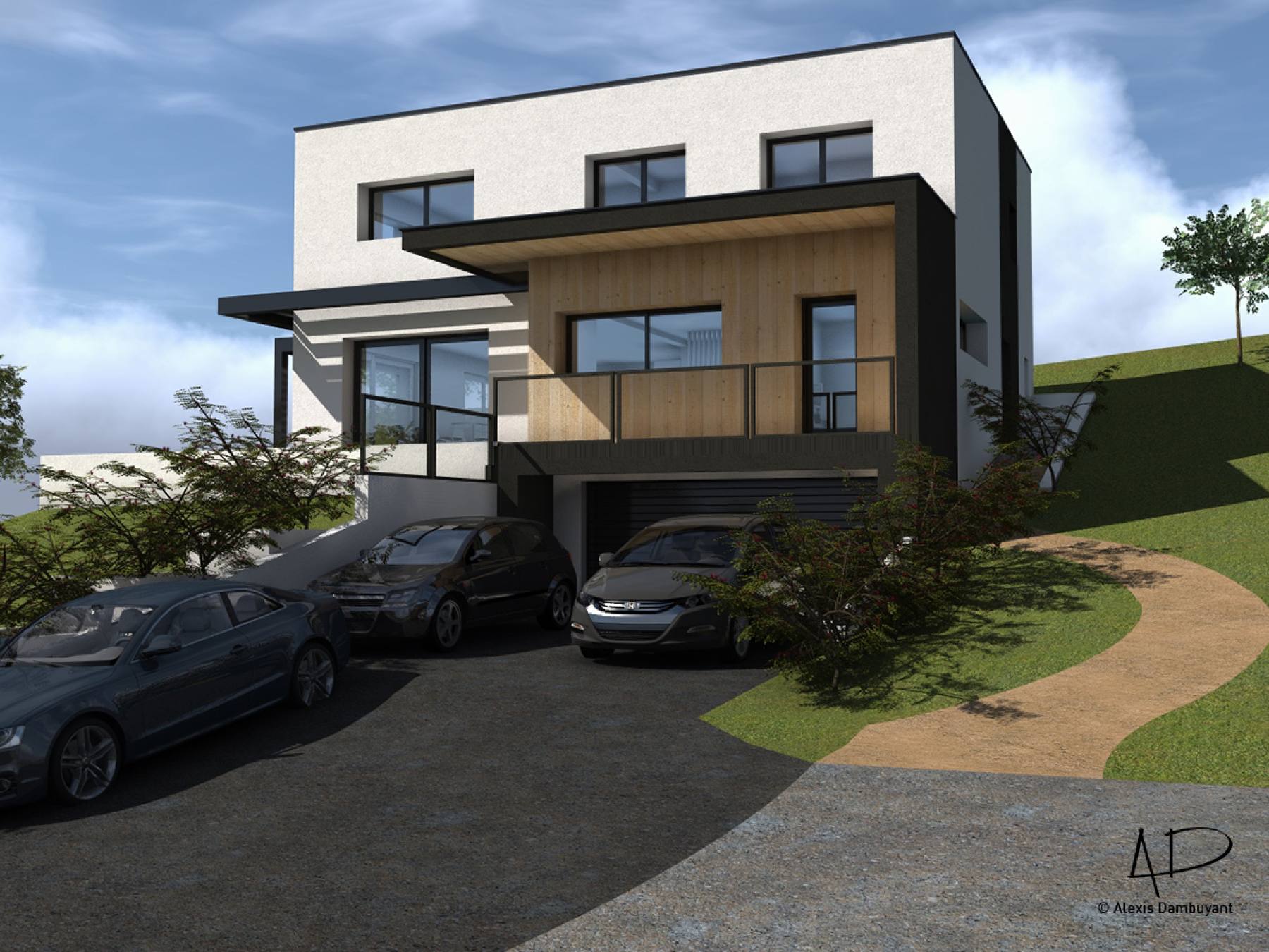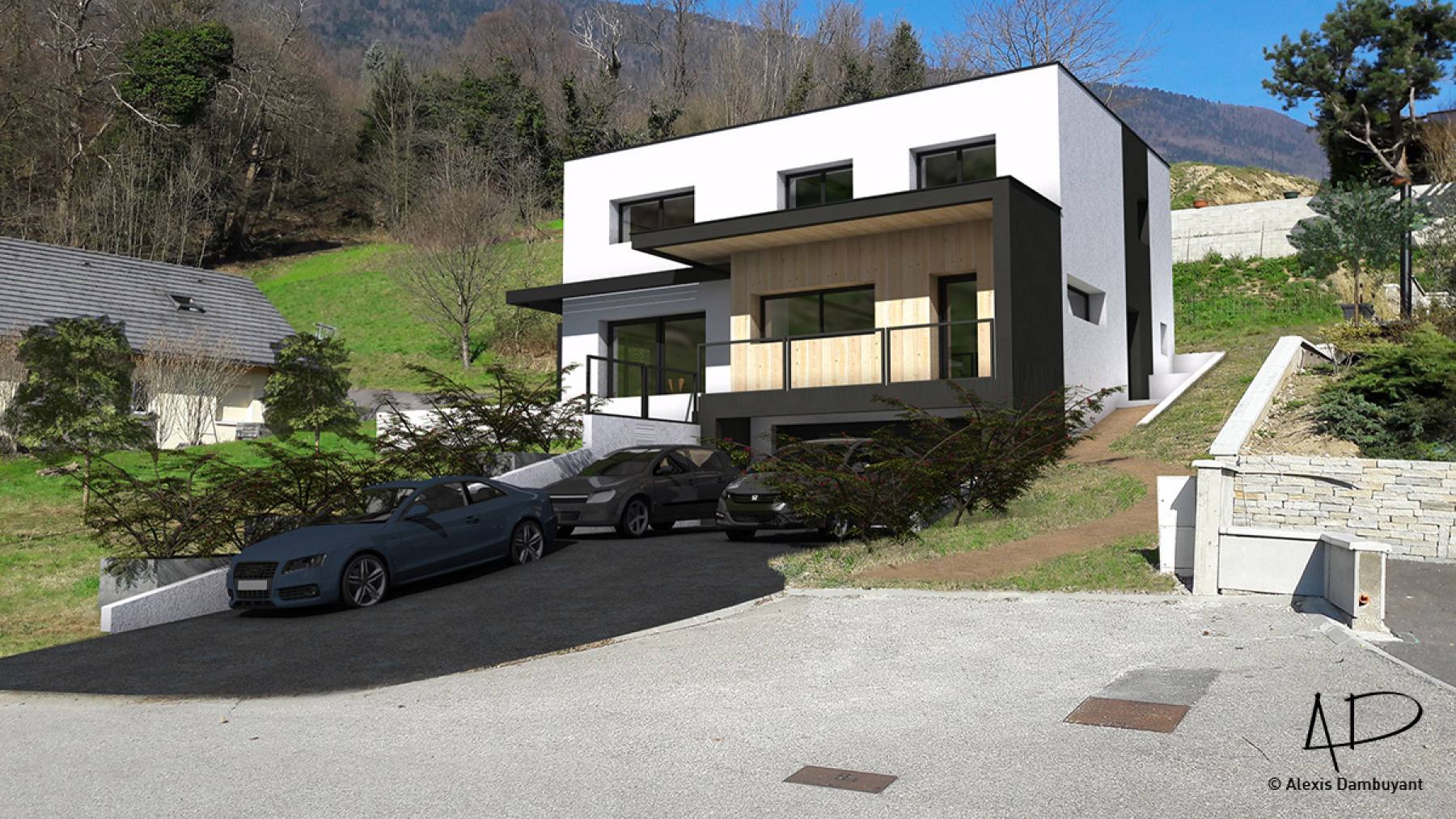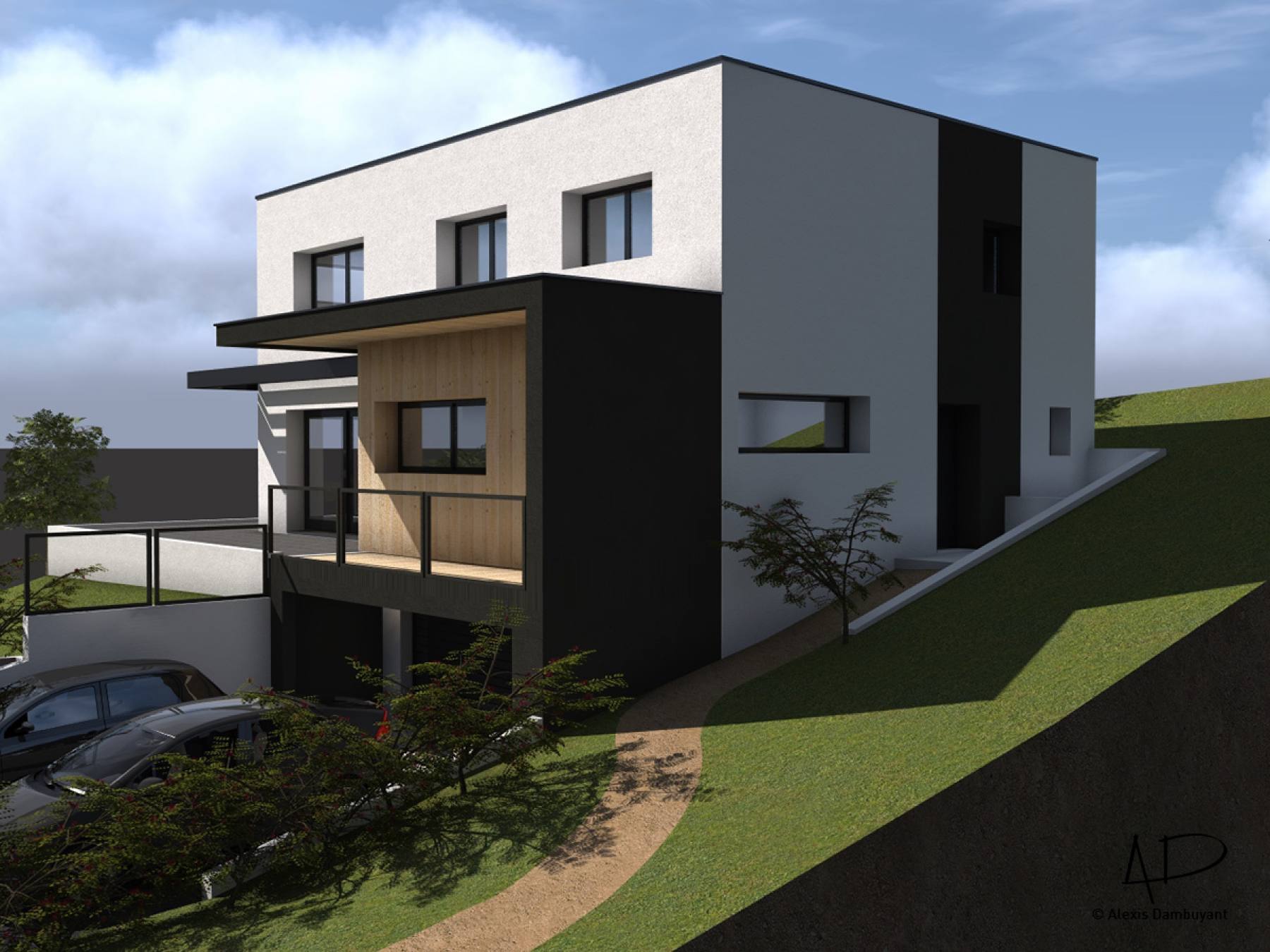 Le projet consiste en la création d'une maison individuelle de deux étages d'habitation (R+1) et d'un sous-sol semi-enterré de stationnements clos et couverts. Un aménagement des abords direct en espaces de verdure (zones engazonnées) sera mis en place selon prescriptions du règlement du POS révisé. La construction est implantée en partie Nord-Ouest de la parcelle, en limite de prospect. Cette implantation permet de dégager le terrain en partie Sud et Ouest et profiter de la vue ainsi que d'une orientation climatique performante. Le bâtiment est conçu avec une architecture de type contemporaine, avec des volumes simple et épuré. Les volumes sont travaillés dans une logique de compacité et d'intégration tout en intégrant des éléments architecturaux permettant de créer du dynamisme et du relief au projet. Les éléments tels que brise-soleil ou la casquette en partie Sud permettront d'animer les volumes avec des jeux d'ombres et de lumière mais également de participer au confort solaire des habitants. Les matières et teintes utilisées sont peu nombreuses (3 teintes et matières au total) afin de garder une esthétique épurée et garder une lecture simple mais dynamique de la façade. Le jeu de teinte et de matière permet d'animer la façade. Le bâtiment est conçu afin de tirer le meilleur profit possible du climat, de la topographie et de la qualité paysagère environnante. Sa forme compacte et encastrée ainsi que son orientation générale lui permettront de gagner en qualités énergétiques.