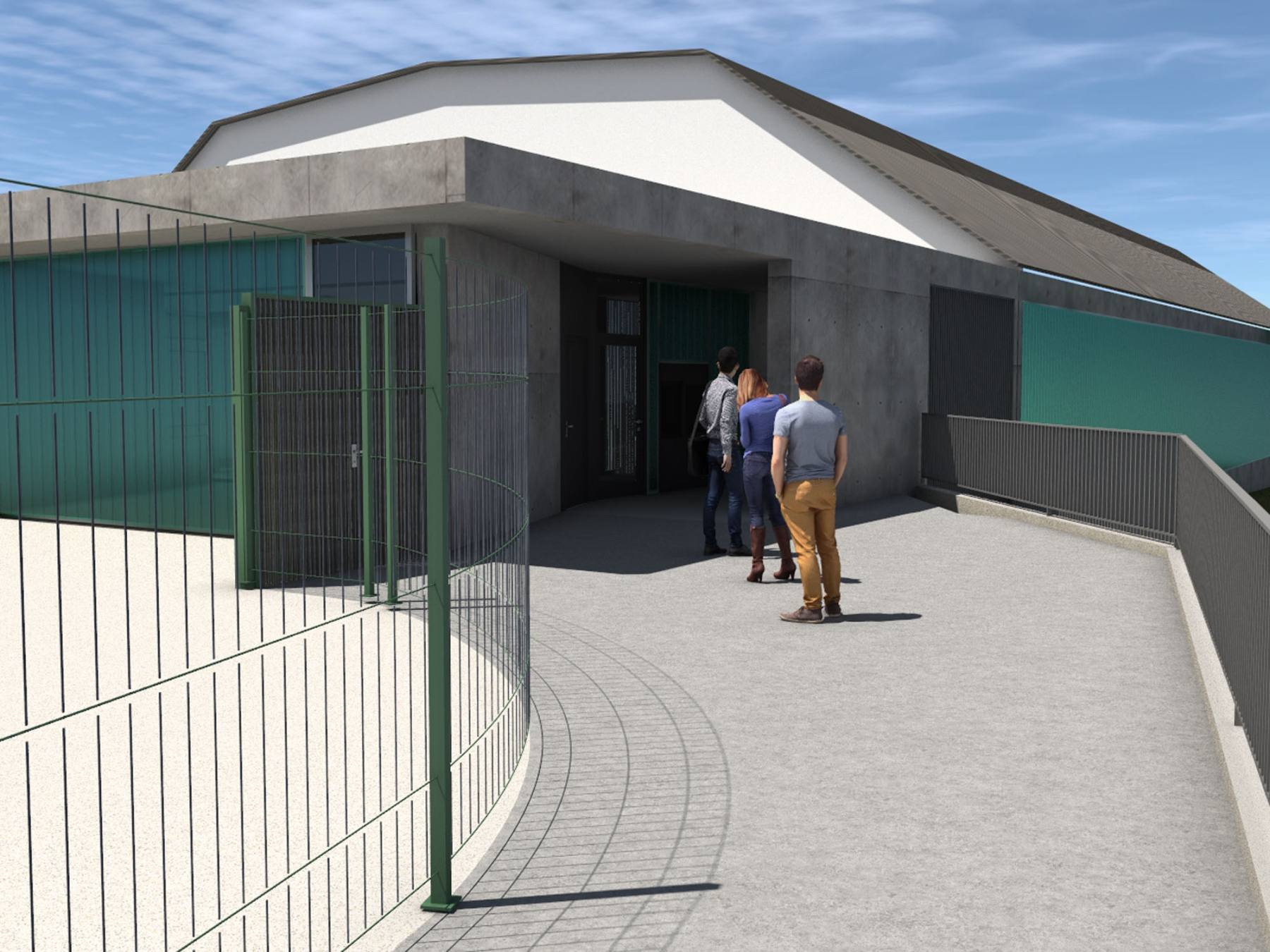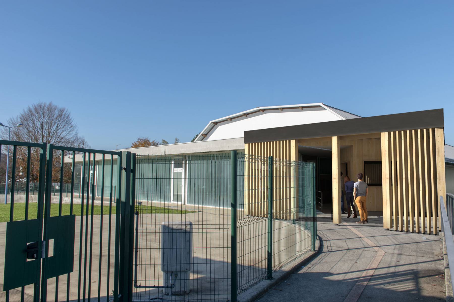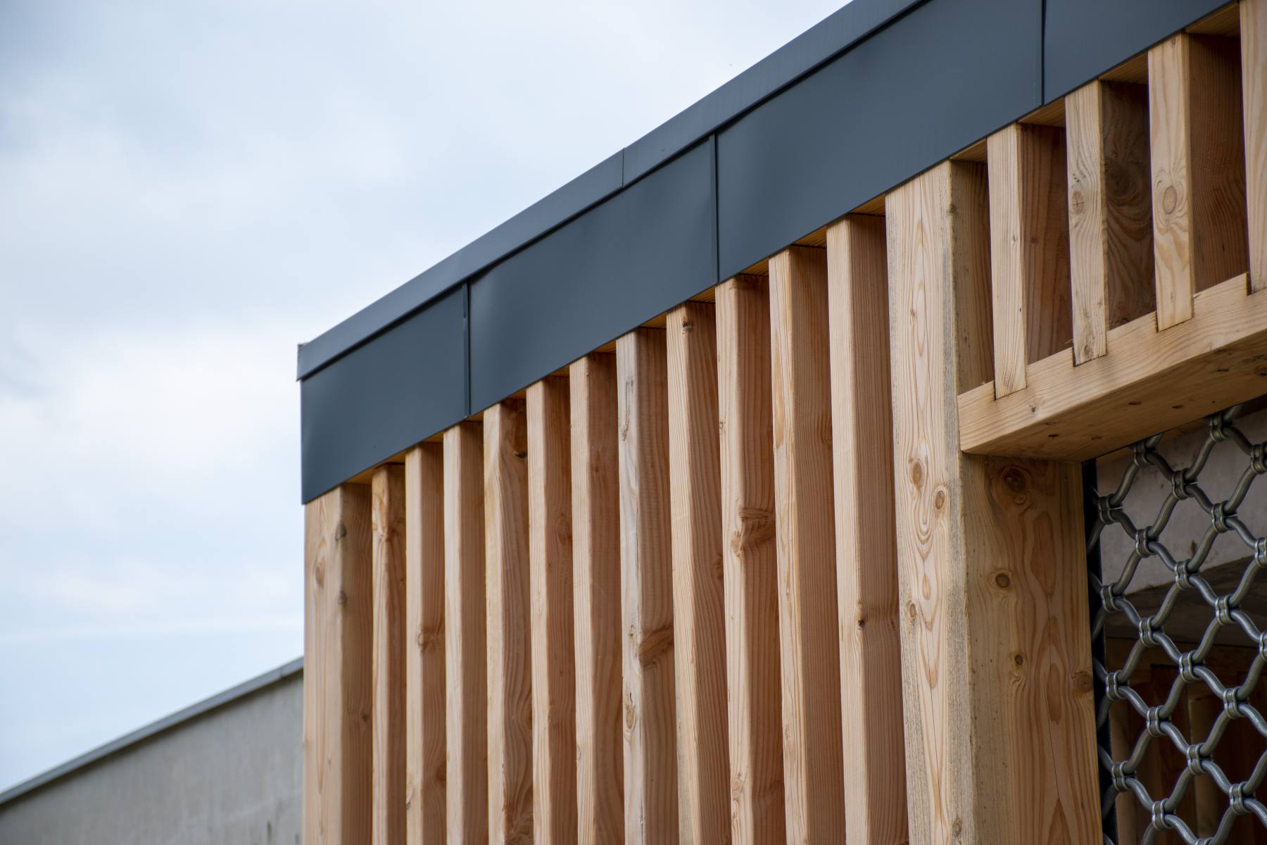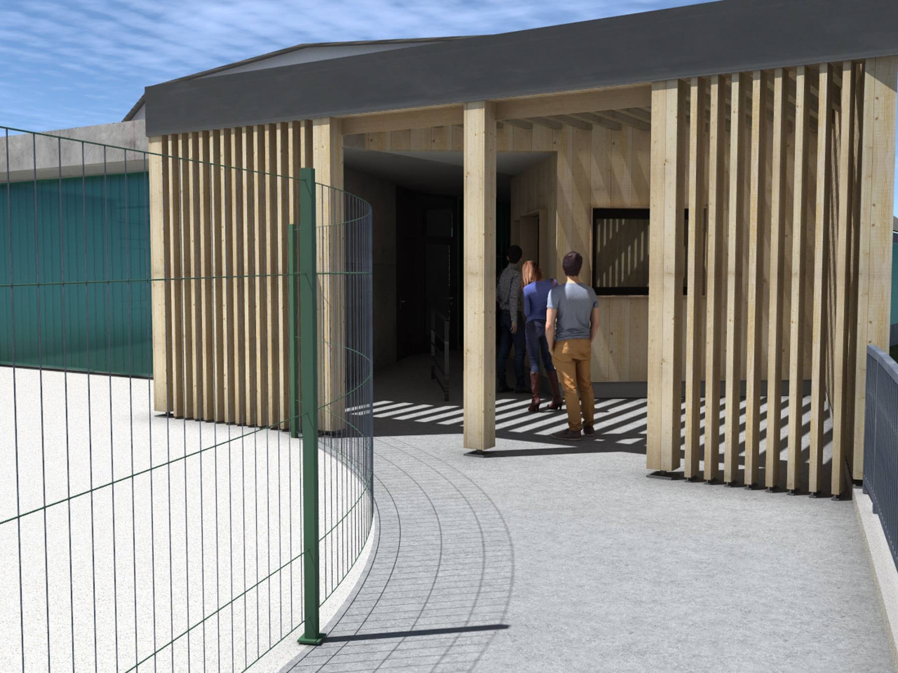Le dialogue entre la partie existante et l'extension se veut fort et marqué. L'extension se distingue architecturalement et dans l'emploi des matériaux vis-à-vis de l'existant, mais l'intégration est malgré tout travaillée au travers d'une réinterprétation du langage, des lignes, de la forme et des proportions existantes. L'ensemble est traité en ossature bois avec un habillage en bardage vertical ou en claustra bois de teinte naturelle. Le bois apporte une nouvelle matérialité au bâtiment ; les teintes naturelles contrastent avec le béton brut de l'existant. L'accueil se veut plus visible, plus chaleureux, tout en dialoguant avec l'architecture existante.