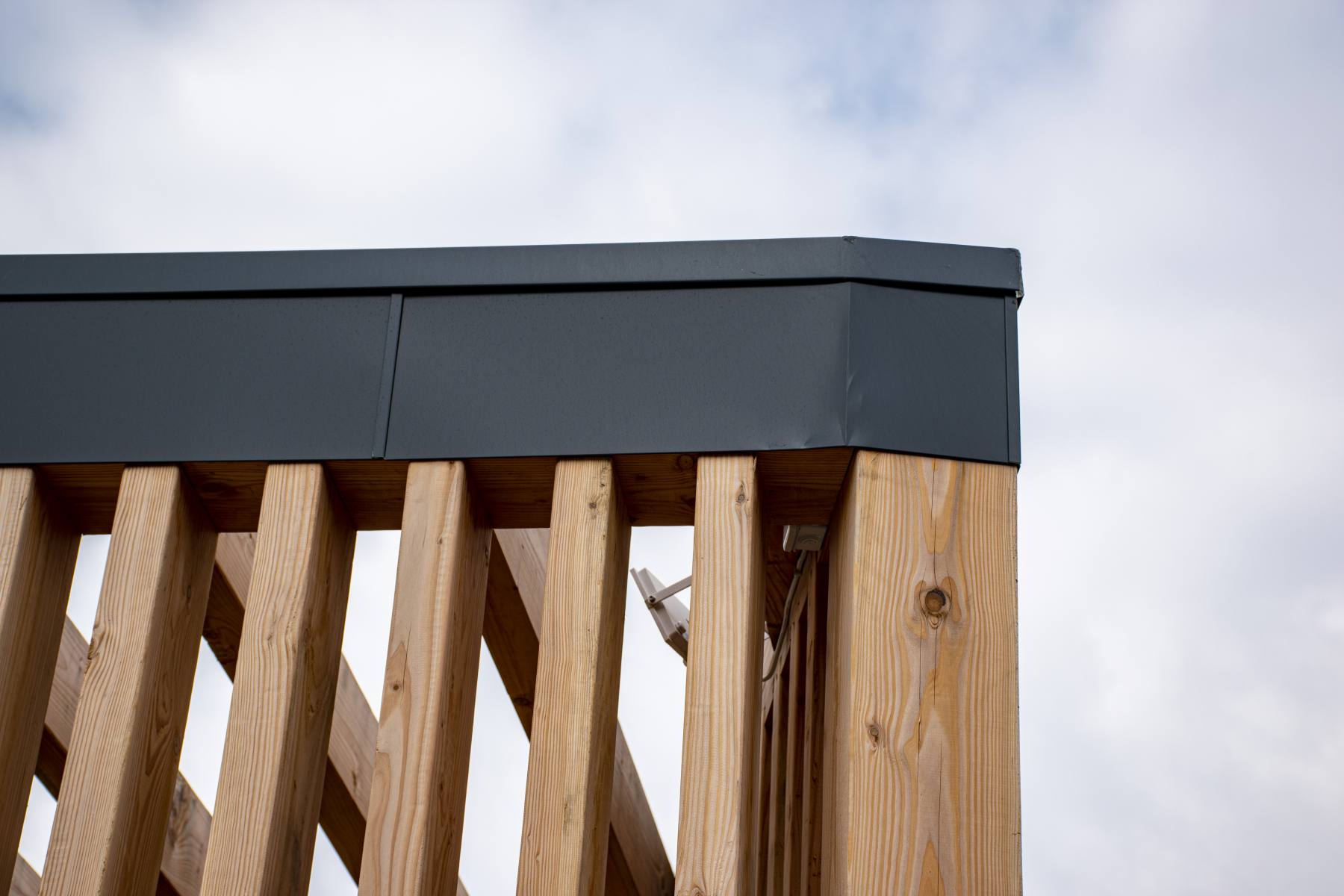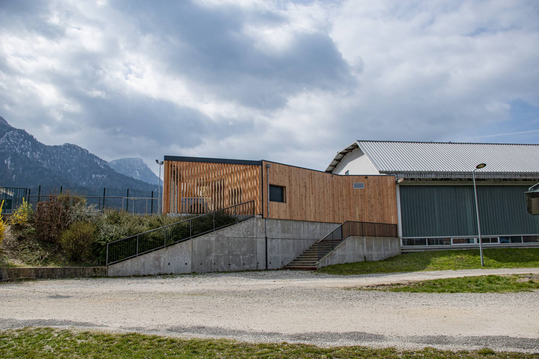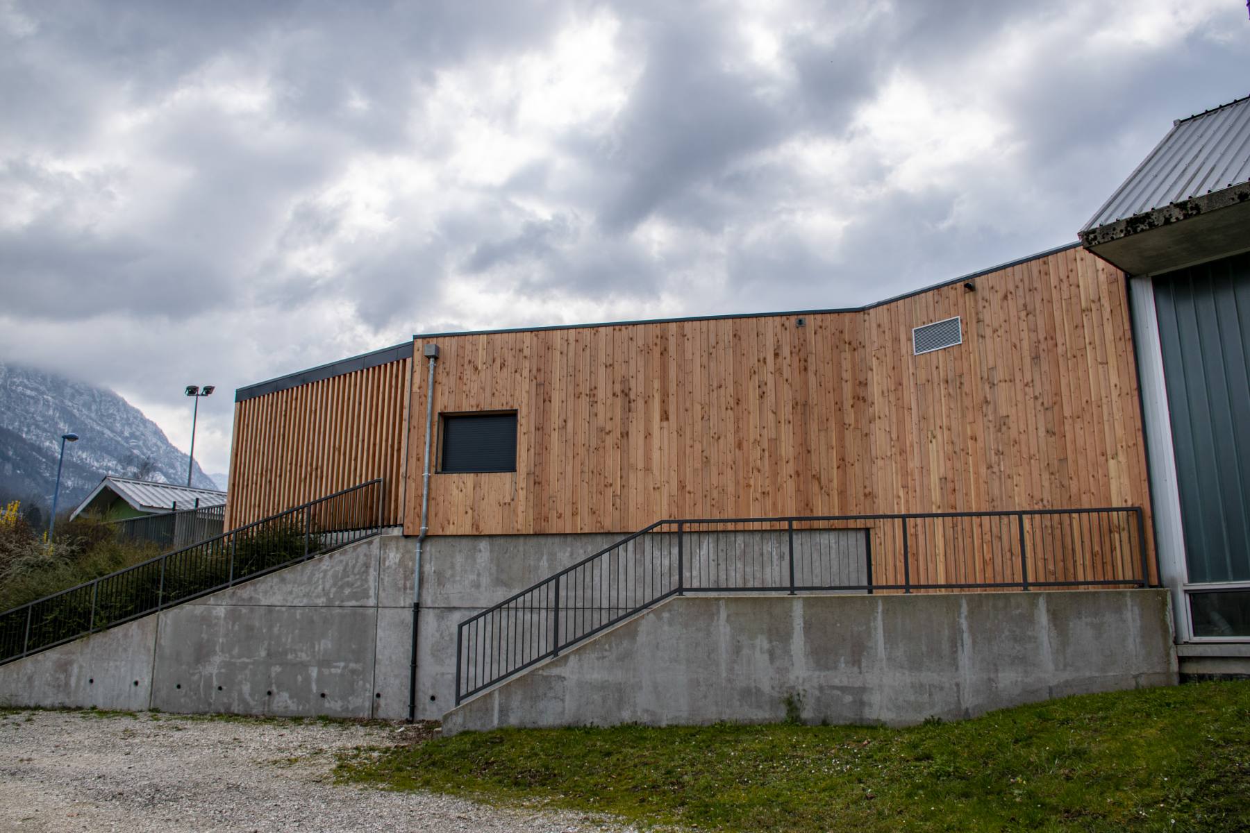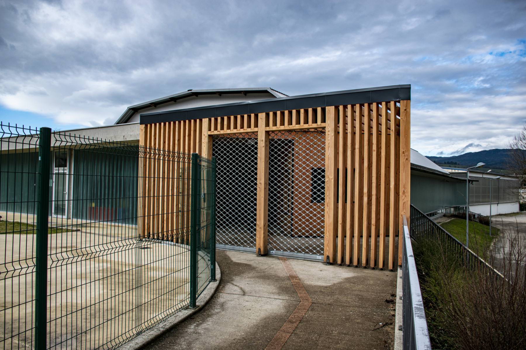 Le dialogue entre la partie existante et l'extension se veut fort et marqué. L'extension se distingue architecturalement et dans l'emploi des matériaux vis-à-vis de l'existant, mais l'intégration est malgré tout travaillée au travers d'une réinterprétation du langage, des lignes, de la forme et des proportions existantes. L'ensemble est traité en ossature bois avec un habillage en bardage vertical ou en claustra bois de teinte naturelle. Le bois apporte une nouvelle matérialité au bâtiment ; les teintes naturelles contrastent avec le béton brut de l'existant. L'accueil se veut plus visible, plus chaleureux, tout en dialoguant avec l'architecture existante.