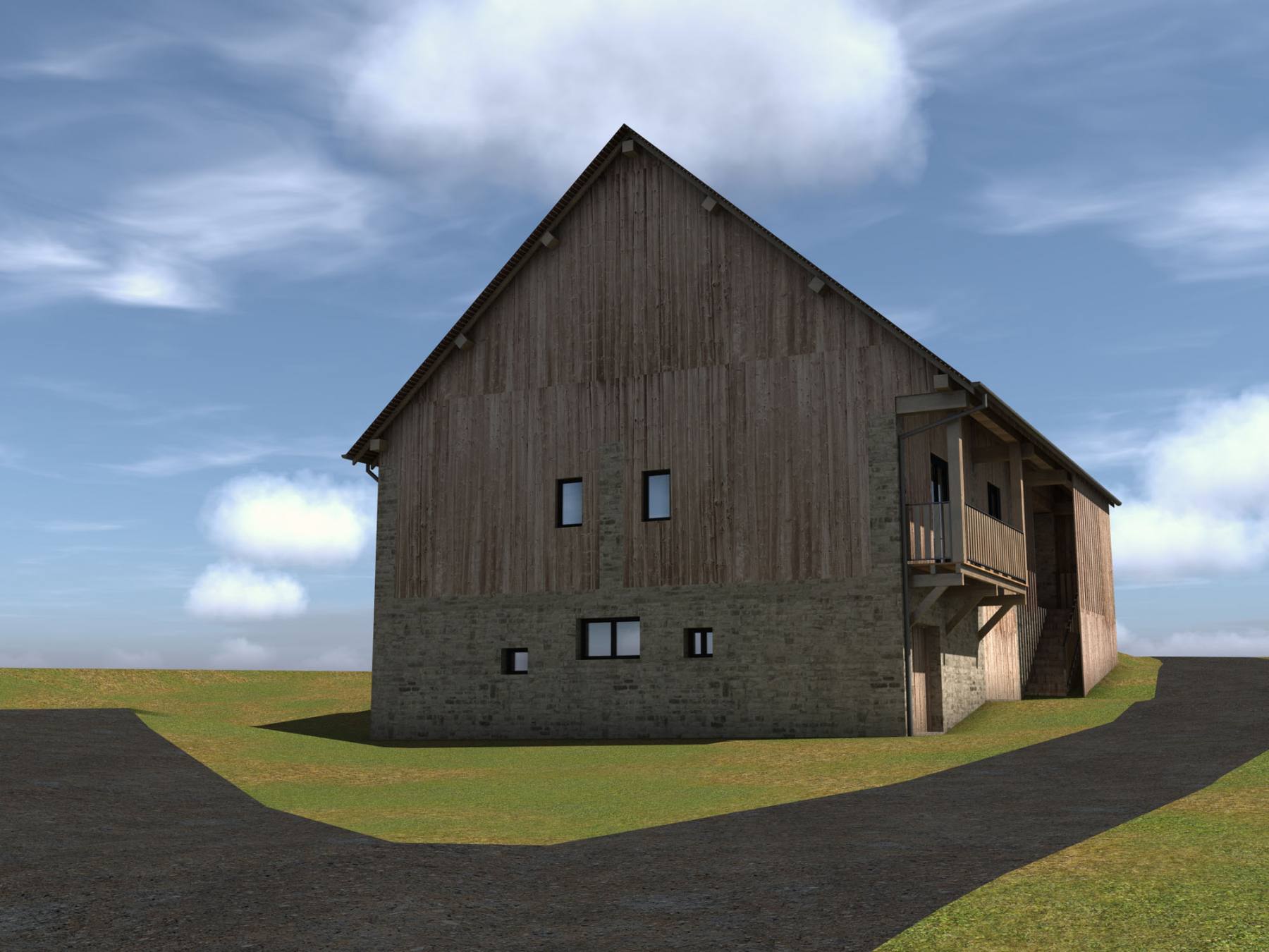 La rénovation du volume va dans le sens d'une revalorisation du bâtiment dans son environnement ; nous avons souhaité mettre en valeur les pierres apparentes de la façade, reprendre la couverture et l'enduit existants mais aussi remplacer le bardage d'origine de façon à rendre au bâtiment son esthétique traditionnelle. La création de baies, aux proportions « plus hautes que larges », a été pensée pour s'intégrer au mieux à l'environnement et respecter les prescriptions architecturales locales. Les baies des façades Est et Ouest seront dépourvues de volets afin de respecter l'esthétique traditionnelle de la grange. L’appentis situé en partie Ouest est conservé et adapté pour intégrer un escalier permettant l'accès vers la partie R+1 du bâtiment