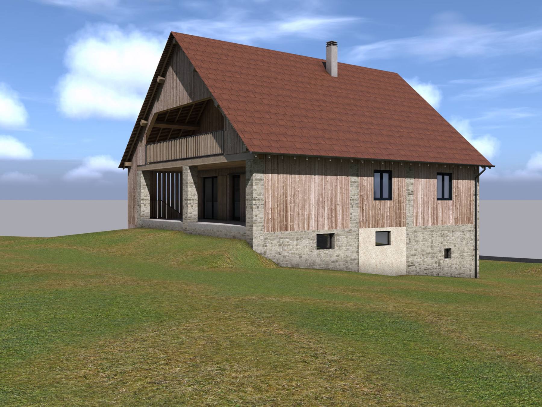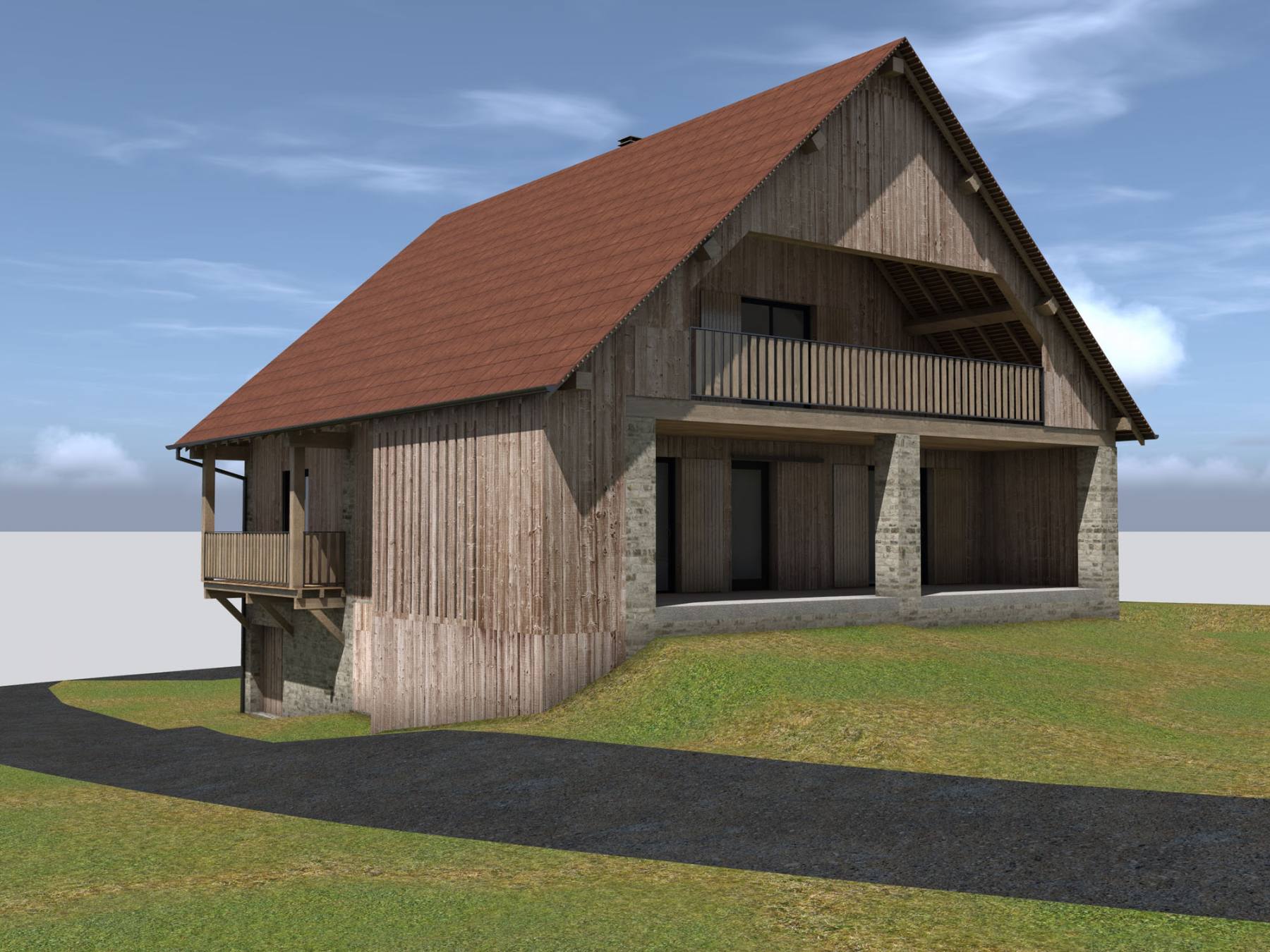 Le projet consiste en la transformation d'une grange existante en un bâtiment à usage d'habitation. Un espace extérieur type loggia est créé côté Sud en intégration avec le volume principal et dans le respect de l'architecture locale (bois et ferronnerie pour garde-corps). L’emprise du bâtiment reste inchangée. La structure du bâti (murs périphériques et toiture) est conservée dans son ensemble, aucune extension n'étant prévue. L'enveloppe possède donc les même dimensions, les débords de toitures, pentes, distances par rapport aux limites sont inchangées et sont identiques à l'existant.