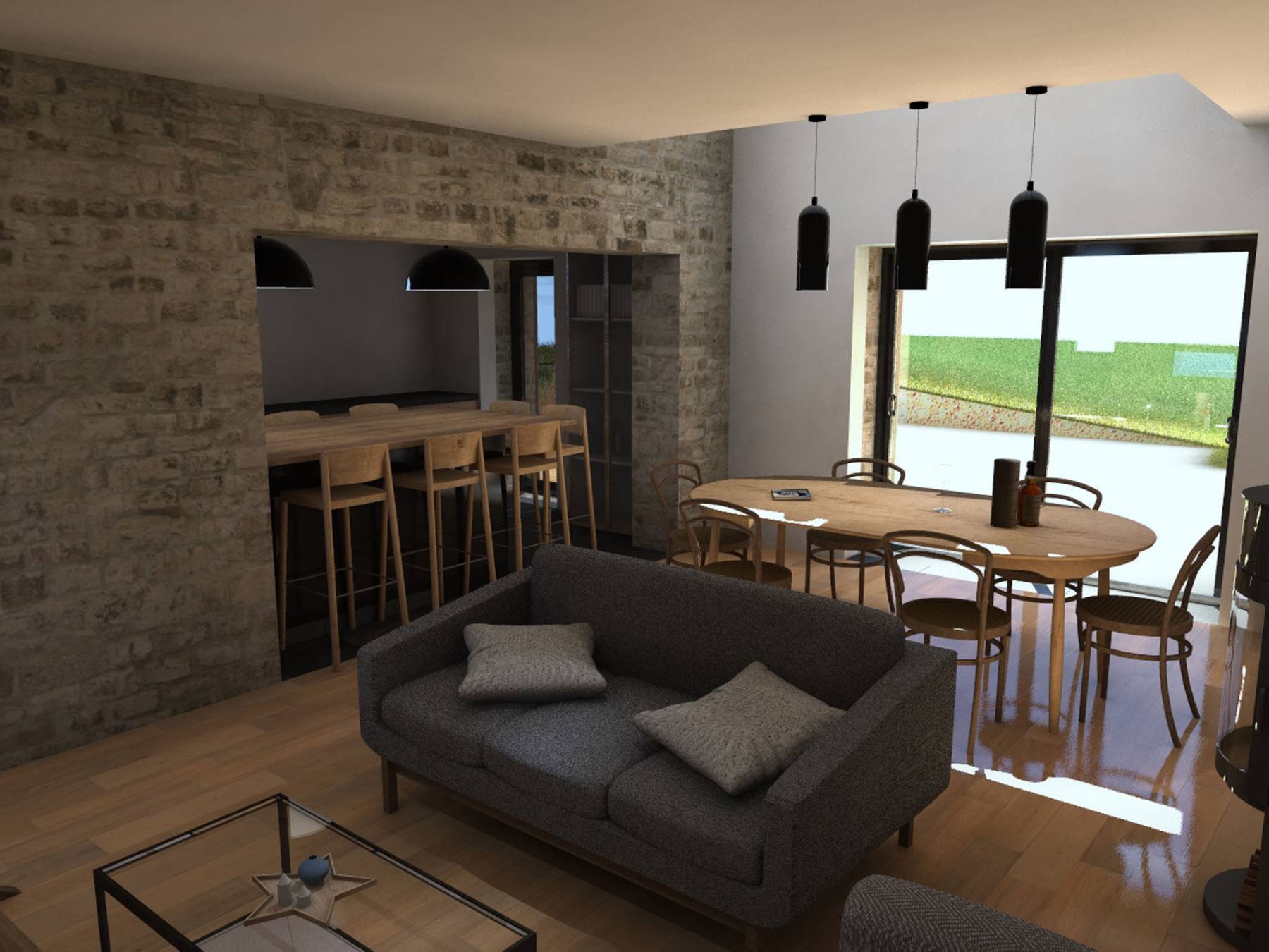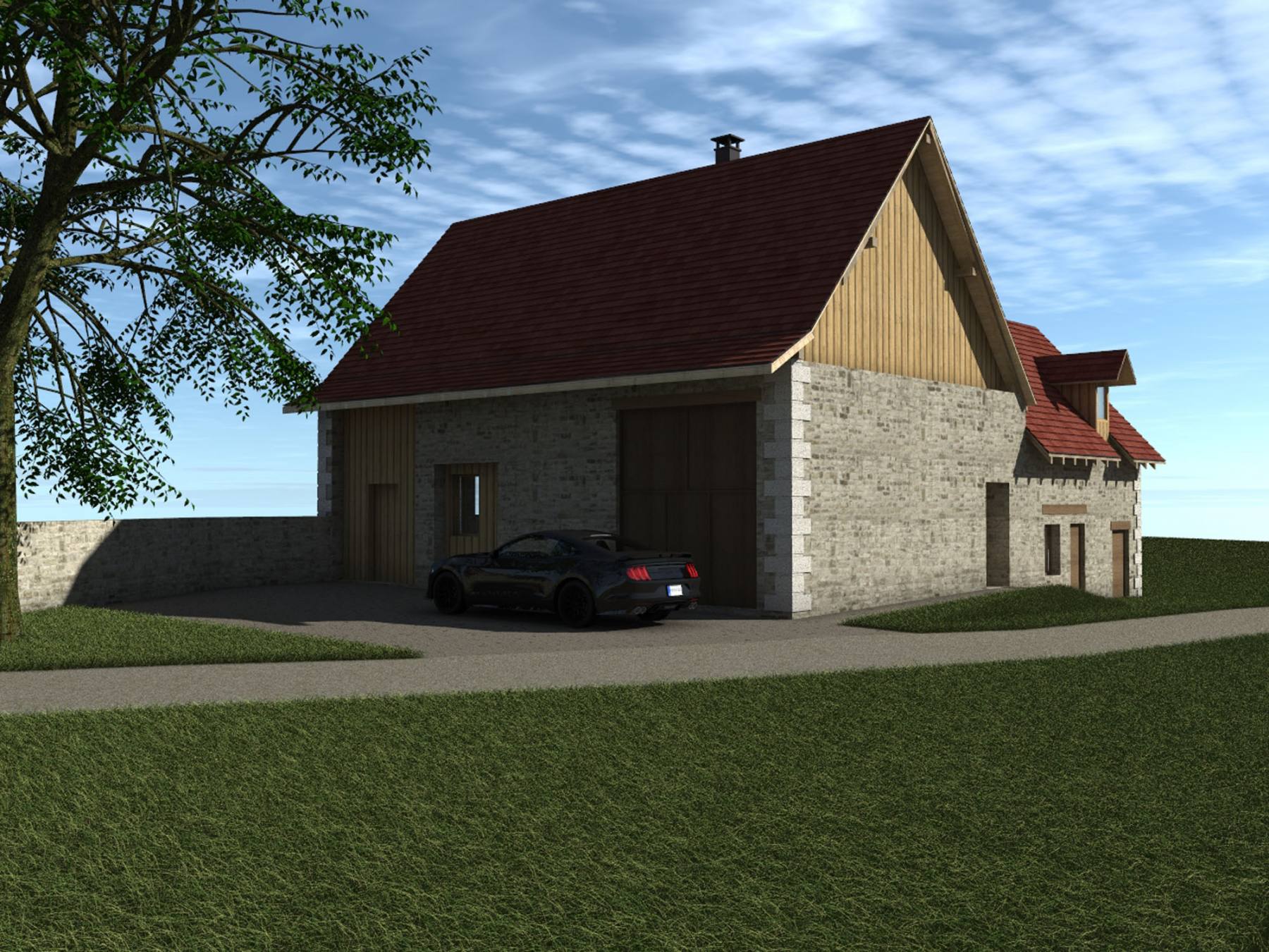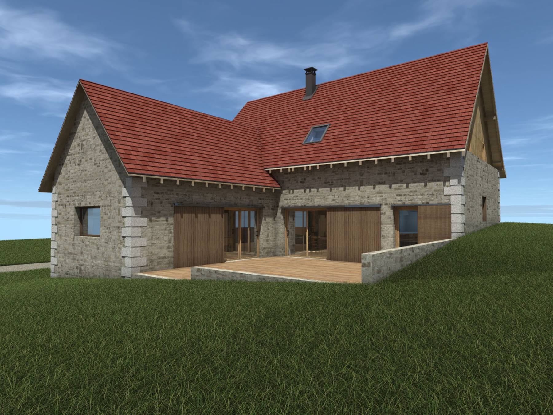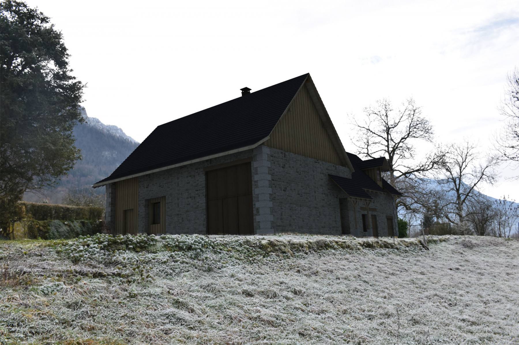 Le projet consiste en la transformation et la réhabilitation d'un bâtiment existant agricole en une habitation. L'ensemble du projet s'effectue dans le volume existant, sans extension ni modification de volume (hors menuiseries et reprises de façades) et sans ajout de surface plancher supplémentaire. L'entrée, située côté Ouest, est positionnée légèrement plus haut que le terrain naturel qui suit une pente le long de la façade. Un remblai ponctuel et de faible importance sera mis en place le long de la façade afin de pouvoir accéder à la porte d'entrée. La zone terrasse a été traitée avec un léger décaissement pour permettre de créer une terrasse en bois à double niveau.